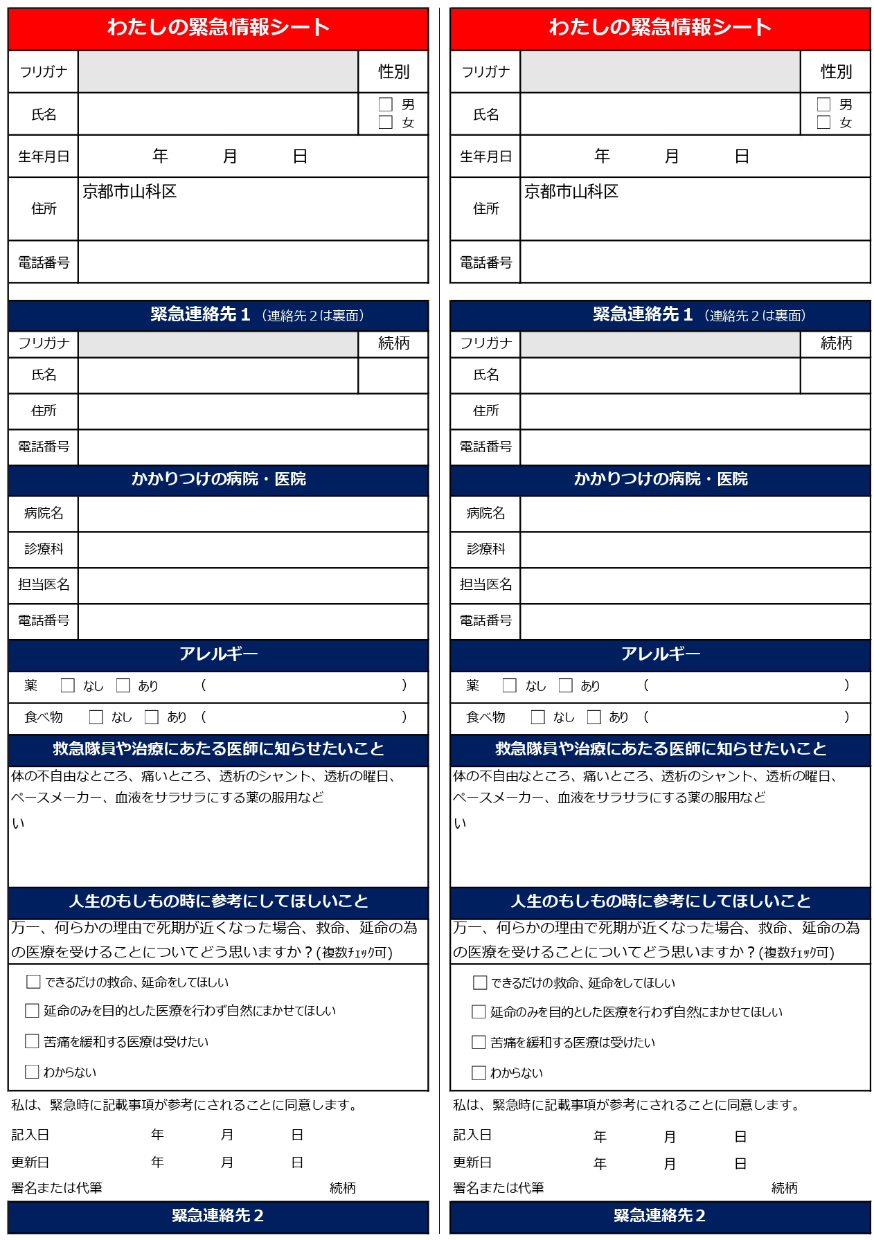 ご高齢の方,持病をお持ちの方などの安全・安心を確保するための用紙です。緊急時の連絡先,かかりつけ医,アレルギー,基礎疾患などの情報を記入します。この用紙をご自宅に保管したり,携帯しておくことで急病,事故,災害などの際に,適切な治療をいち早く開始でき,大切な命を救うことにつながります。
